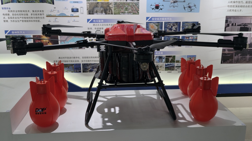呼和浩特低空经济产业园展示的一款消防无人机。 澎湃新闻记者 王岱玉 图
