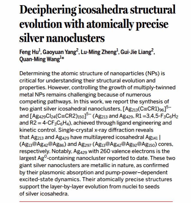 近日,学校功能材料研究院梁桂杰教授参与合作的研究论文《Deciphering icosahedra structural evolution with atomically precise silver nanoclusters》在《科学》(Science)期刊上正式发表(Science, 389, 6763: 921–924)。